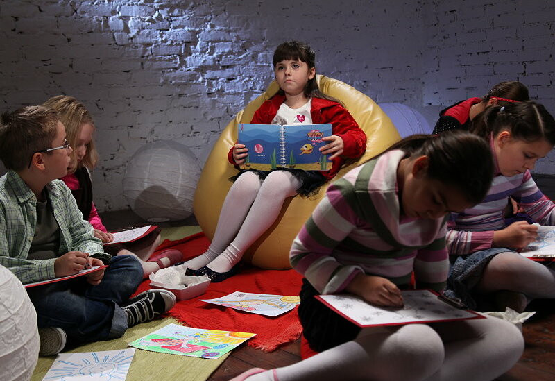 są rysunki stworzone przez dzieci, a scenografią - naturalne otoczenie, jak wnętrze księgarni lub pokój dziecięcy.