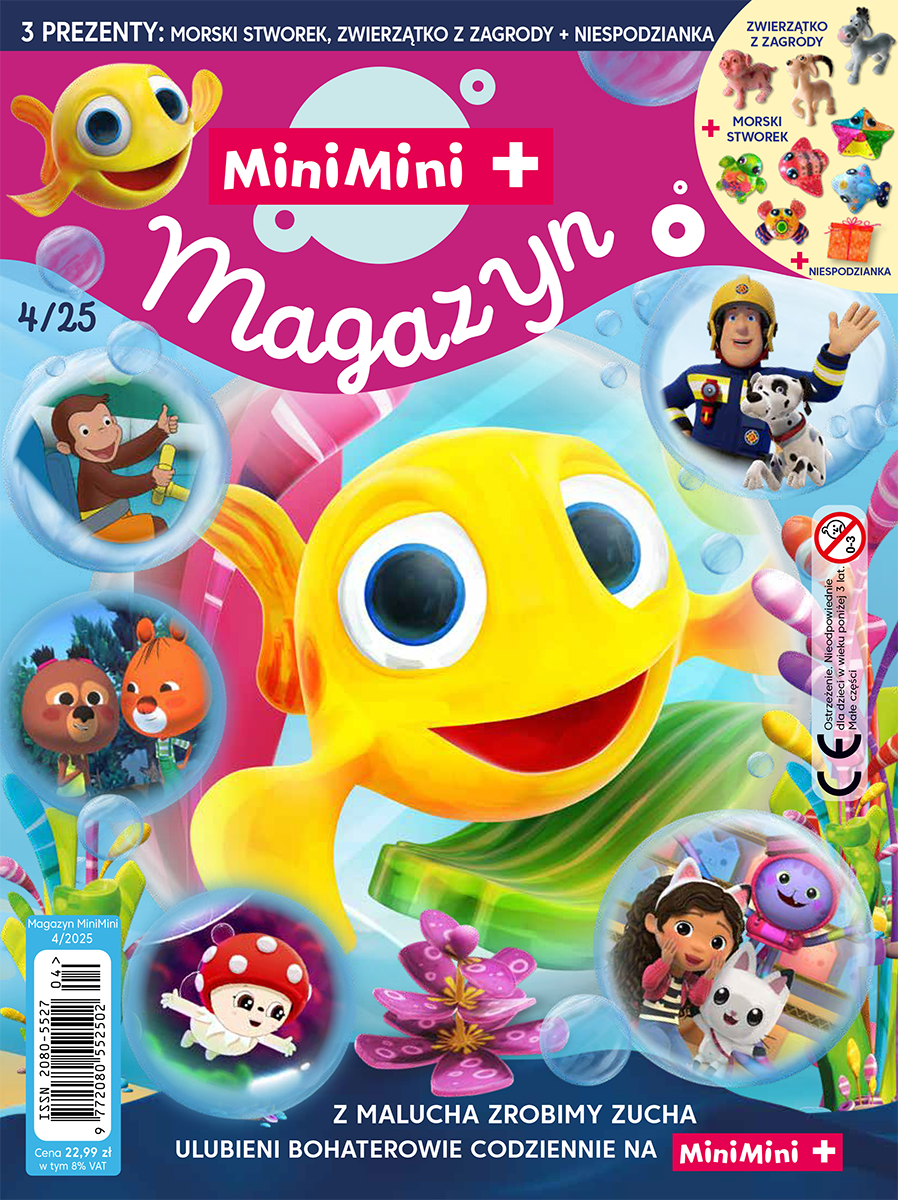 Czwarty numer magazynu MiniMini jest wypełniony atrakcjami od pierwszej strony do ostatniej. Na Czytelnika czekają aż trzy prezenty: morski stworek, zwierzątko z zagrody i niespodzianka!