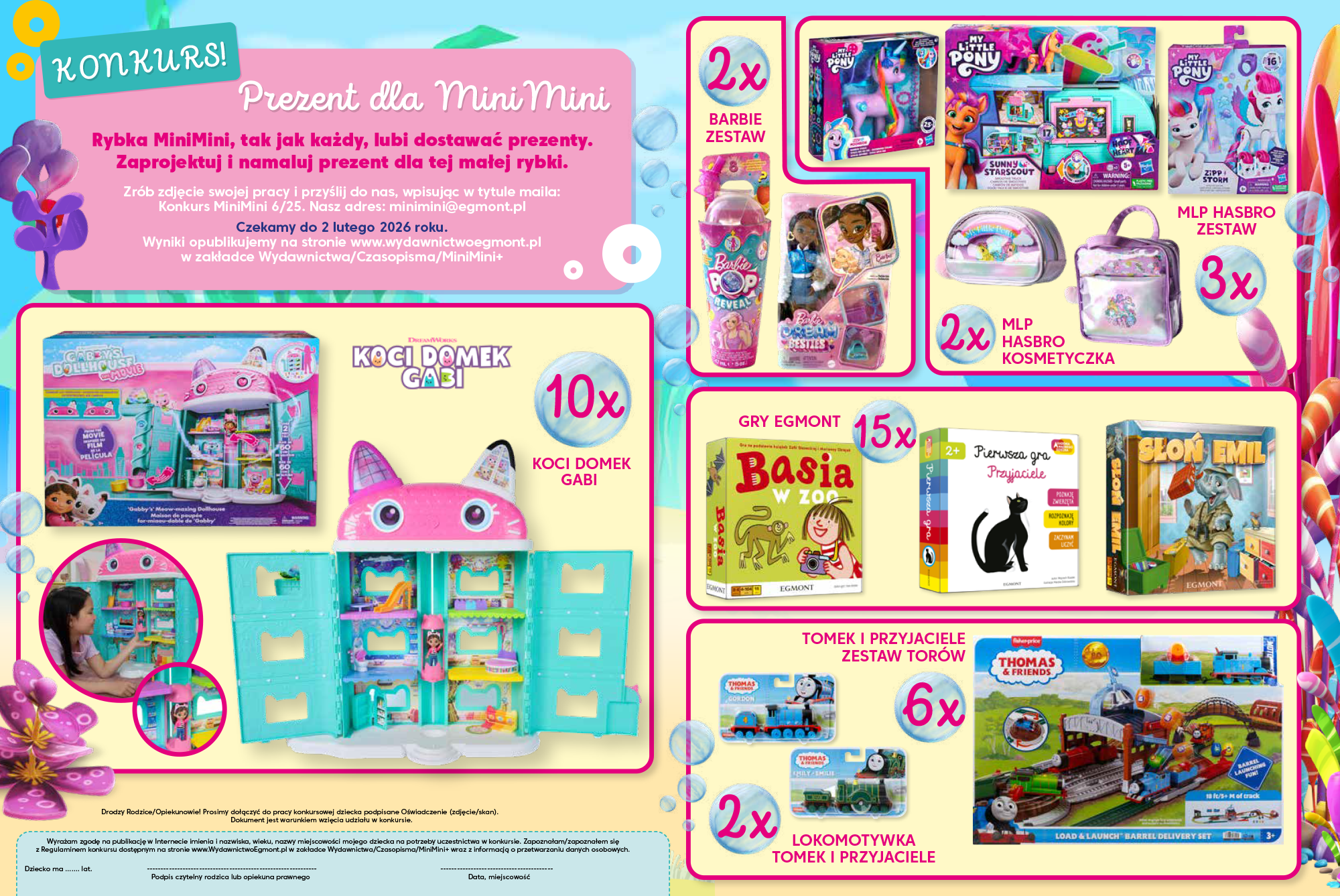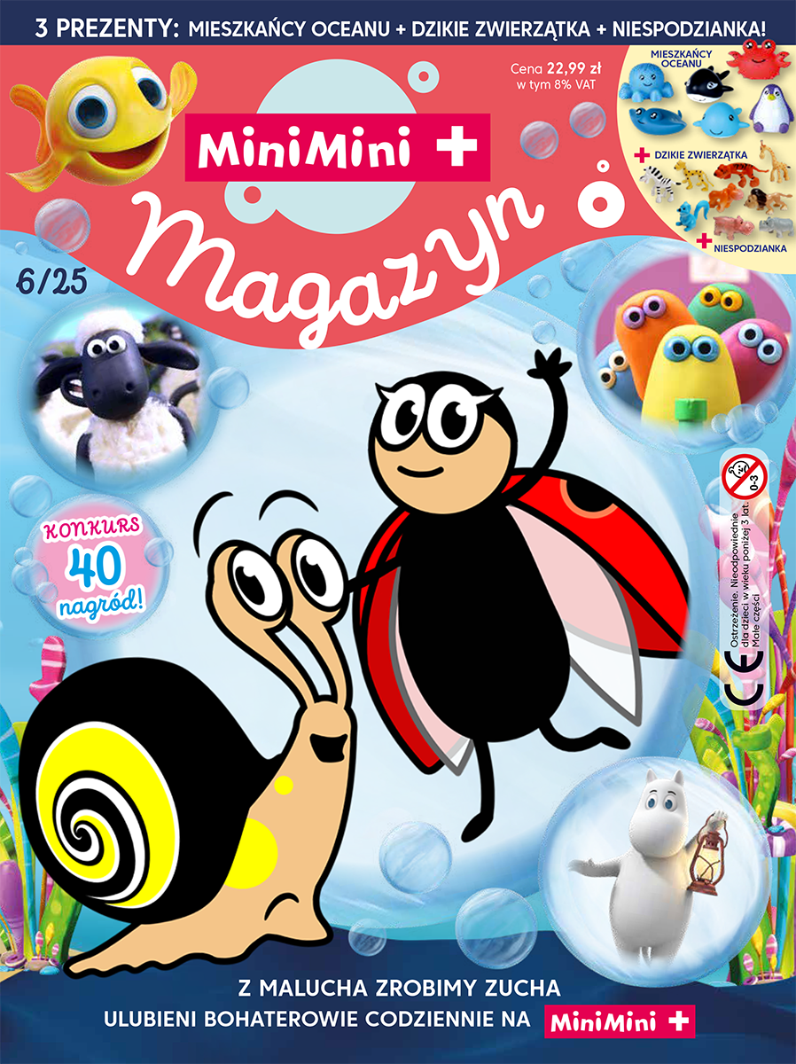 Oprócz rybki i jej podwodnych przyjaciół, poznasz dzieci, Anię i Piotrusia, do których domu przez przypadek trafia rybka MiniMini. Czy uda jej się wrócić do oceanu? Musisz to sprawdzić! Z bohaterami kreskówki „Baczne oczka” rozwiążesz kilka zadań na spostrzegawczość. Potem czas na wybryki baranka Shauna i jego paczki. Na kolejnych stronach magazynu bardzo małe kreaturki poznają nowe smaki, a ty wraz z nimi. Weź też udział w wyścigu przez płotki. Mamy także w tym wydaniu kilka ciekawostek o kolczastych cudakach, jakimi są jeżowce. Na koniec konkurs ze wspaniałymi nagrodami. Jest ich aż 40!!! Warto wziąć w nim udział!